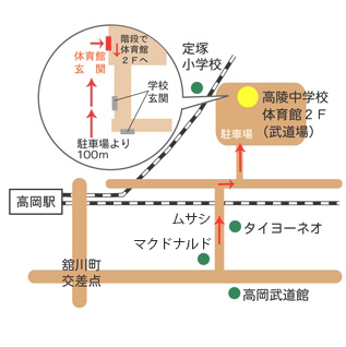 高陵中学校の正門を校舎沿いに100mほど奥へ行ったところに、体育館玄関があります。体育館玄関を右に進んで階段を2Fに上ると武道場になります。(体験料がおひとり1,000円かかります。)